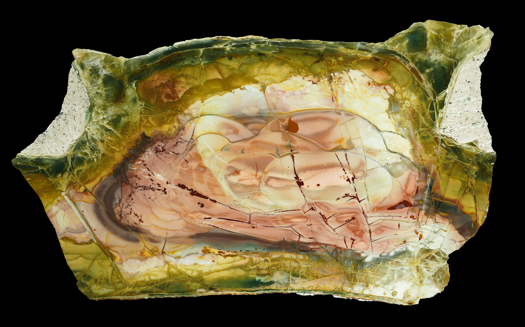 ほとんどがスライスされてしまうため、このような1面カットのディスプレイ向きの標本は、入手困難です。