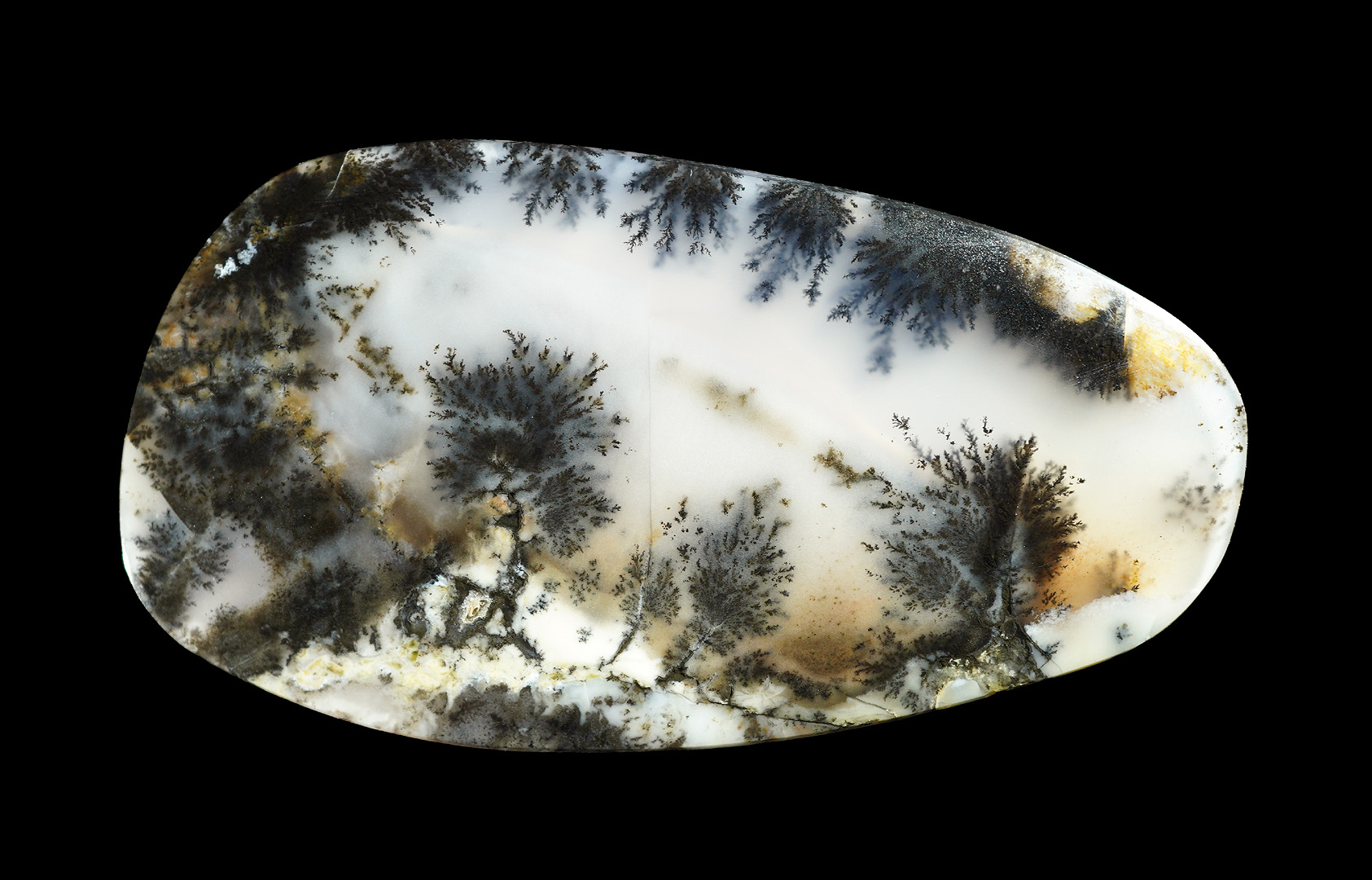 コモンオパールが混在するアゲートの中に、酸化マンガンによる黒い樹枝模様(デンドライト)が入っております。